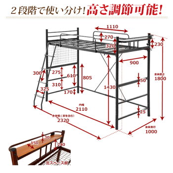 高さ調整可能!宮・コンセント付き ロフトベッド【ORCHIS-オーキス-】ベッドが便利空間に早替わり! 高さ調整可能のロフトベッド!ハイタイプ・ミドルタイプに高さ調整可能!さらにコンセント付きの宮棚付き! 極太パイプを採用でさらに安心・安全!カラーは選べる4色展開! 商品名高さ調整可能!宮・コンセント付き ロフトベッド サイズ外寸:ハイタイプ:幅232cmx奥行き100cmx高さ180cm ミドルタイプ:幅232cmx奥行き100cmx高さ111cm ※商品重量:(約)49kg 材質スチールパイプ 、MDF 備考・お客様組立商品です ・梱包サイズ:2梱包でのお届けとなります (1/2)105×22×117cm(2/2)102×11.5×117cm ・梱包重量:(約)51kg ・耐荷重 : 約120kg 送料送料無料北海道・沖縄・離島を含む(一部配送不可地域)のご注文は配達不可のためキャンセルさせて頂きます。