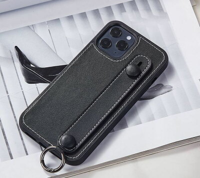 レザー調の素材に白のステッチがおしゃれな、落下防止ベルト付きiPhoneケース♪