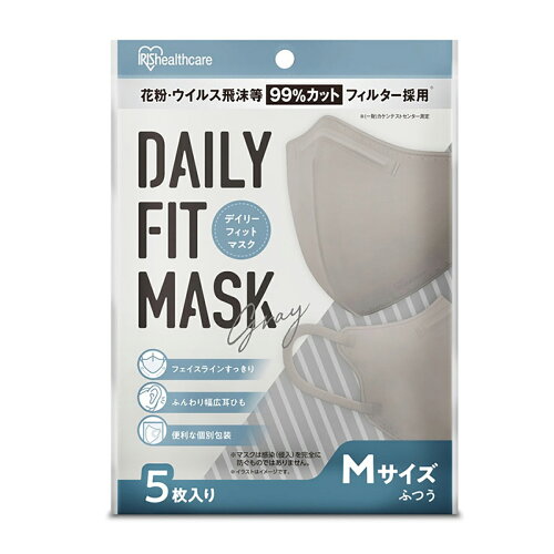 アイリスオーヤマ DAILY FIT MASK デイリー フィット 立体形状 マスク 5枚入 M ふつうサイズ グレー 灰色 個別包装 (幅125×高155mm 使い捨て不織布マスク) (4967576557610)
