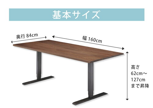 内容量 ・天板(最大幅160cm・奥84cm)×1枚 ・鉄脚×2本 ・電動備品×1式 カラー ウォルナット ■天板:クリア色艶消し(ウレタン塗装) ■脚:黒艶消し(焼付塗装) 素材 ■天板:ウォルナット集成材、ポリウレタン塗料(クリア色) ■脚(アダプター・スイッチ付):鉄 焼付塗装(黒) ■電動昇降脚(中国製) 提供者 栄和装工 商品説明 1本脚のスッキリとしたスタイルの昇降テーブルは、スイッチ押すだけで簡単に高さ62cmから127cmまでミリ単位で調整可能です。